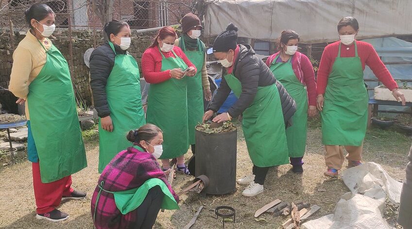 Setting up of demonstration site has helped to build capacity and disseminate the knowledge of vegetable farming to wider groups of the local communities apart from direct beneficiaries. The demonstration site has facilitated in out scaling of locally appropriate climate-smart agriculture practices among farmers through “learning by doing”. Climate-Smart Agriculture (CSA) technologies, such as the use of biochar formation machines, drip irrigation kit, Integrated Pest Management (IPM), composting, and mulching via the use of jute have been demonstrated in the demonstration site of the land plot of 2738 sq. ft. (8 aana) provided by one of the beneficiary farmers. Besides that, vegetable seeds of cauliflower, cabbage, radish, and tomato were planted in the demonstration site together by the beneficiary female farmers according to the knowledge gained during the vegetable farming training.