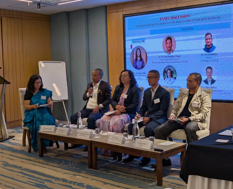 The panel discussion, moderated by Dr. Anusuya Joshi, Senior Environmental Safeguard Expert, brought together experts: Er. Ravi Shakya, Senior Divisional Engineer, Water Resources and Energy Research Center (WRERC), Dr. Jeet B. Chand, Senior Agricultural Engineer, National Agriculture Modernization Program (NAMP), Ms. Shubha Laxmi Shrestha, Deputy Director, Alternate Energy Promotion Centre (AEPC), Mr. Jeeban Baidya, Director, Sunbridge Nepal. The discussion centered on the technical, financial, and institutional barriers to sustaining solar irrigation systems and its way forward in Nepal. The panellists highlighted the need for multi-use of solar energy, research and database of solar irrigation projects, financial access, new business model, coordination among institutions and capacity building activities to sustain the use of solar irrigation. They emphasized the opportunities renewable energy has in agriculture but stressed that it is not a “fit and forget” solution. Regular maintenance mechanisms, local training to build local capacity, and revised after-sales service policies are some of the ways forward for Nepal’s solar irrigation. In the experience sharing session, representatives from various organizations provided their own experiences of challenges faced in solar irrigation and suggested a way forward. The representatives also urged the government to promote public-private partnerships, inclusive governance, and climate-resilient system designs tailored to Nepal’s diverse terrains.